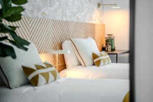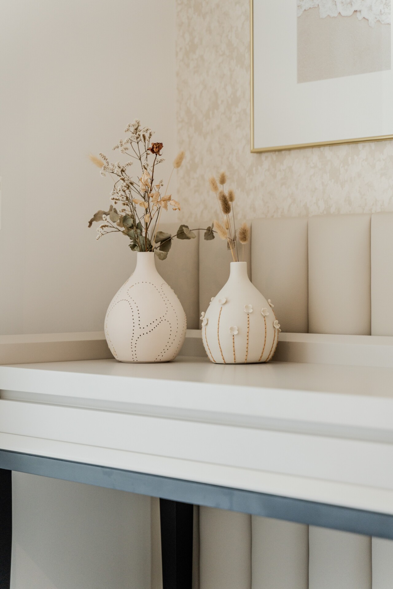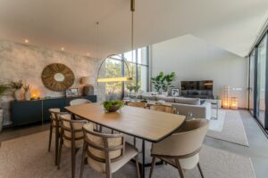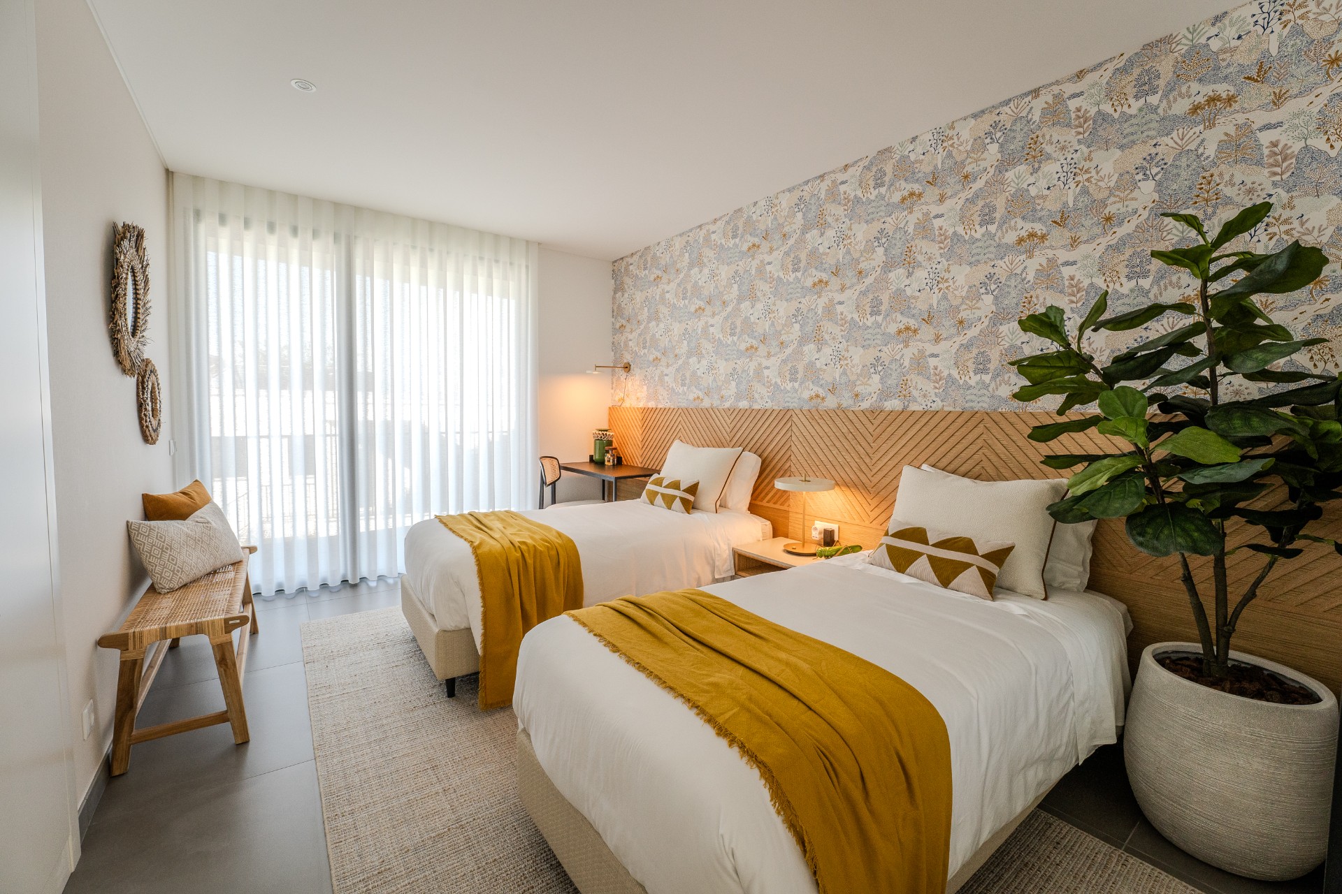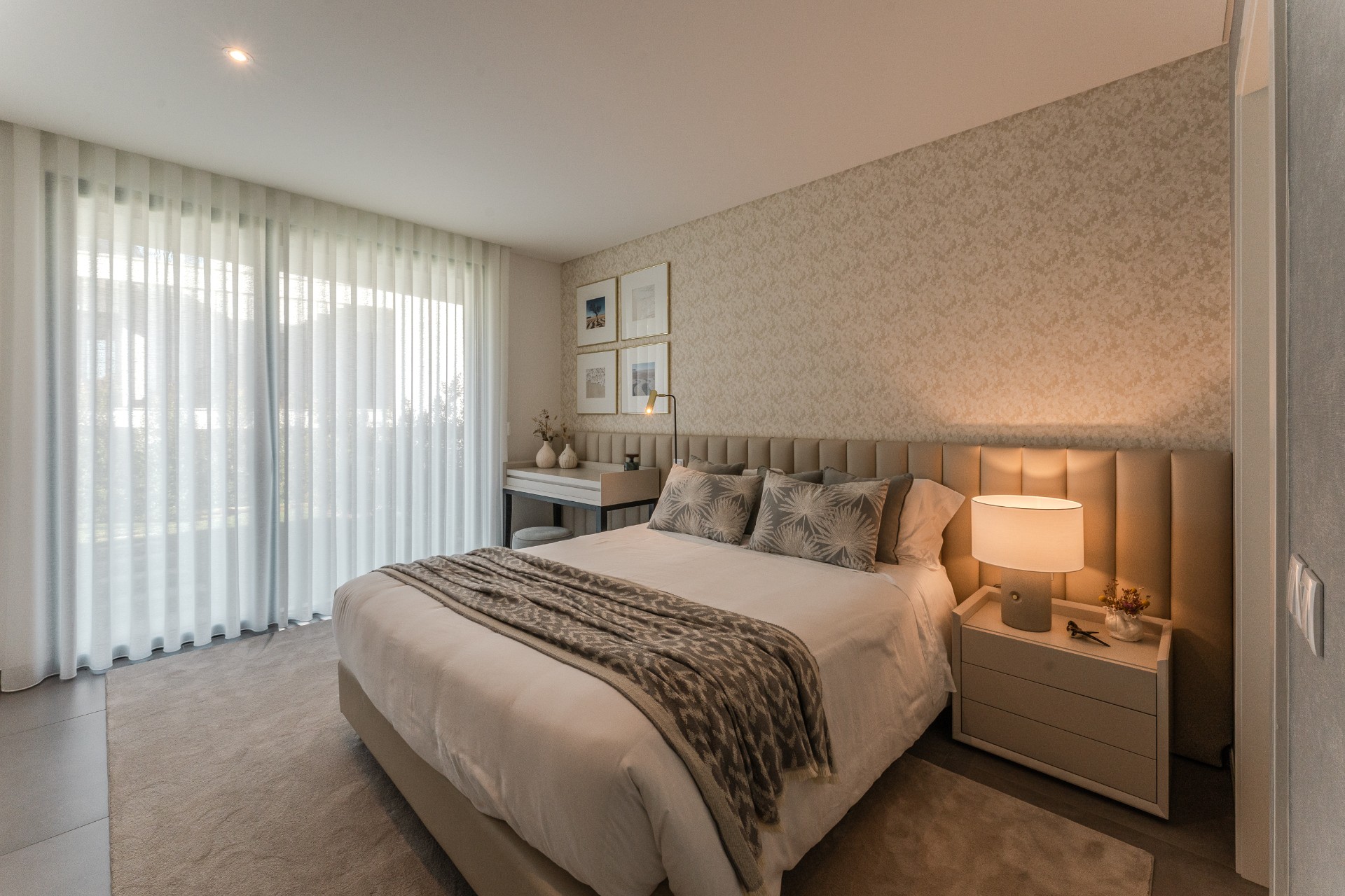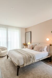 Este projeto destaca-se pelos seus traços orgânicos e pela grande presença de luz natural. A paleta de cores neutras, combinada com a palhinha e a madeira, cria um ambiente moderno e acolhedor. O papel de parede com texturas naturais reforça a proximidade com a praia, proporcionando um espaço contemporâneo e sereno.